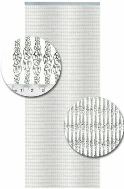 Dit vliegengordijn is gemaakt van buigzaam kunststof. De strengen bestaan uit dikke ronde kunststof draden. In het kunststof zitten meerdere zilveren glitters verwerkt. Het gordijn telt 160 nauwsluitende kunststof draden per meter. De strengen hebben een luxe, chique uitstraling en blijven niet haken zodra je naar binnen of buiten loopt. Het geheel hangt aan een brede witte ophangcassette.