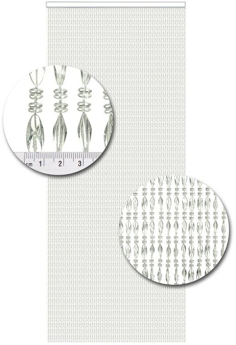Dit zijn kwalitatief gezien echt goede kralengordijnen. De draadjes die gebruikt zijn, zijn gemaakt van nylon en dus extra sterk. De kunststof kralen zijn stuk voor stuk aan het nylon draad gesmolten. Het geheel hangt aan een witte cassette. Het is een vrij dicht kralengordijn waarbij er op circa elke centimeter een streng hangt. Om als voorbeeld even een vliegengordijn met een breedte van 90cm te noemen; hier hangen circa 90 strengen aan.