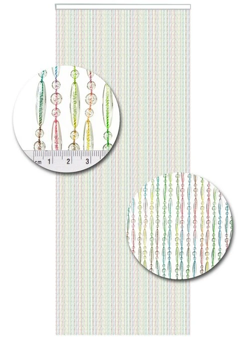 Dit zijn kwalitatief gezien echt goede kralengordijnen. De draadjes die gebruikt zijn, zijn gemaakt van nylon en dus extra sterk. De kunststof kralen zijn stuk voor stuk aan het nylon draad gesmolten. Het geheel hangt aan een witte cassette. Het is een vrij dicht kralengordijn waarbij er op circa elke centimeter een streng hangt. Om als voorbeeld even een vliegengordijn met een breedte van 90cm te noemen; hier hangen circa 90 strengen aan.