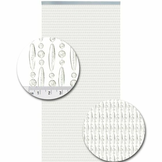 Luxe kralengordijn gemaakt van nylon draad. De kunststof kralen zijn stuk voor stuk aan het nylon draad gesmolten. Het geheel hangt aan een kunststof witte cassette.